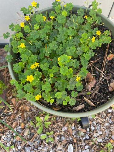 A low-growing herbaceous plant features heart-shaped leaflets in groups of three, resembling clover. It produces small, five-petaled yellow flowers and upright seed pods that explode when touched.