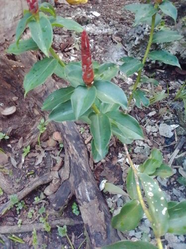 A popular ornamental ginger featuring spiral stems, deep green waxy leaves, and bright red cone-shaped inflorescences from which small orange-yellow flowers emerge.