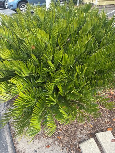 A slow-growing, low-maintenance evergreen cycad that resembles a small fern or palm. It features stiff, feathery green fronds emerging from a thick, underground tuberous stem.