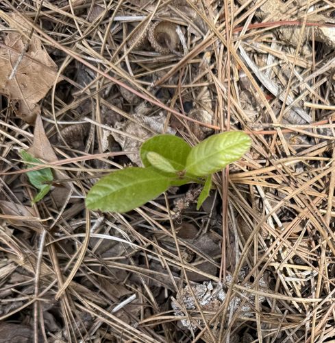 A young woody sapling with bright green, alternate, simple leaves that have visible pinnate venation and slightly wavy margins, emerging from a bed of pine needles and leaf litter.