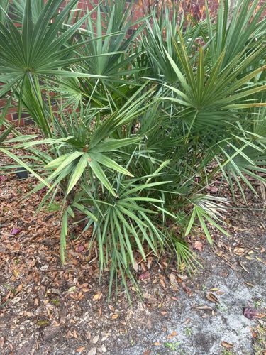 A small, slow-growing palm characterized by fan-shaped green or silver-blue fronds and sharp, saw-like teeth along the stems.