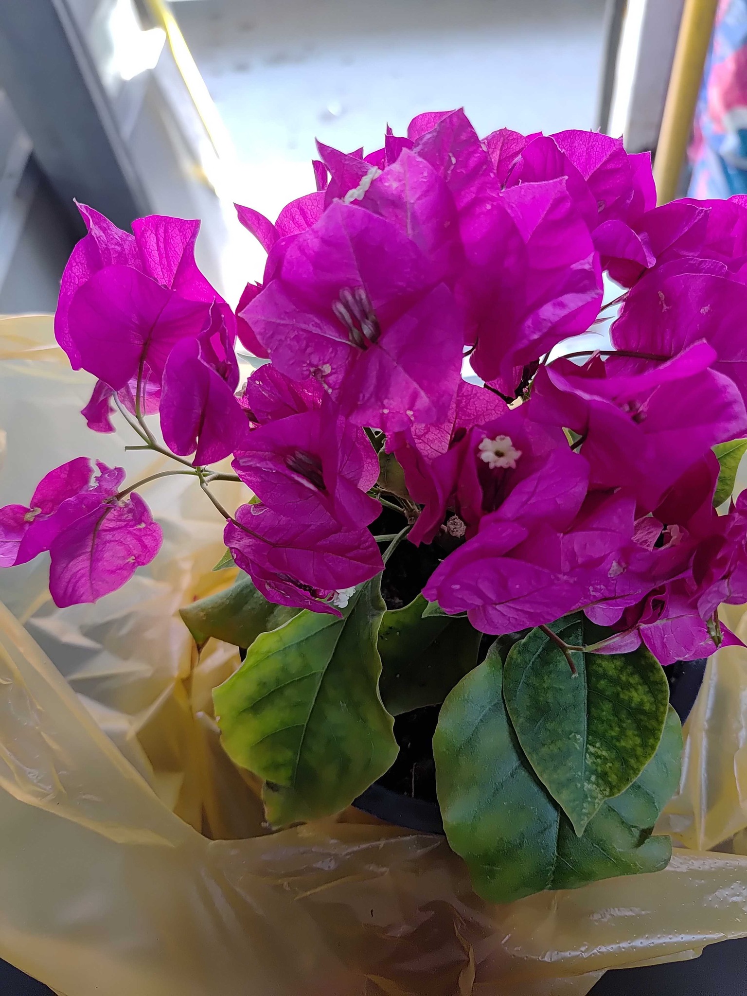 A thorny, woody climbing vine or shrub characterized by its papery, vibrant bracts that surround small, inconspicuous white tubular flowers. It has ovate green leaves and can be trained as a vine, shrub, or bonsai.