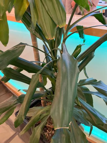 An evergreen shrub with a thick woody stalk and long, arching, strap-like green leaves that resemble corn foliage.