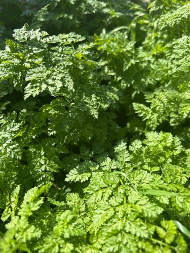 A tall, biennial herbaceous flowering plant with feathery, triangular, finely divided fern-like leaves. It often has purple-spotted hollow stems and clusters of small white flowers in an umbrella shape.