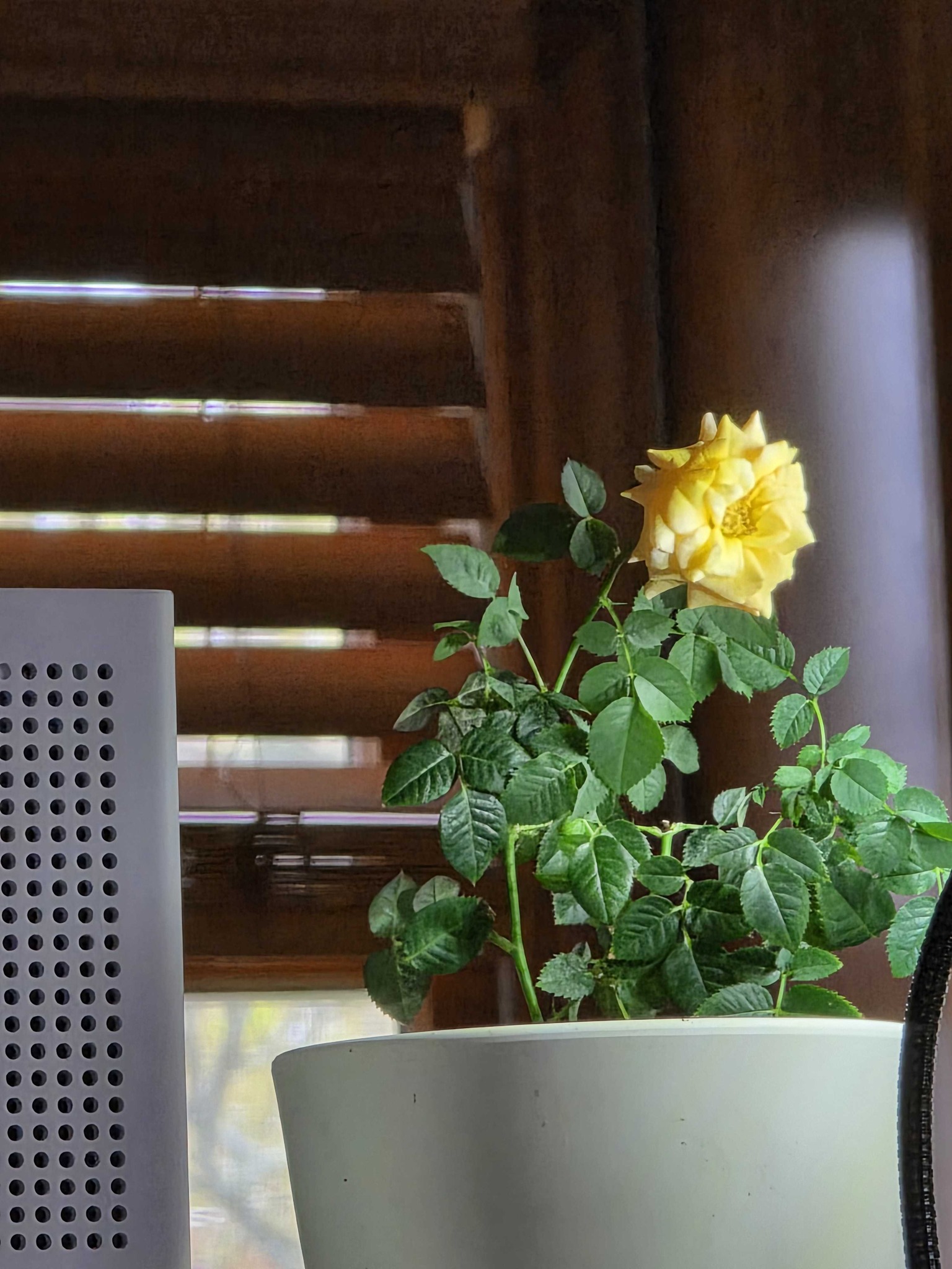 A compact, woody perennial with small, serrated green leaves and multi-petaled yellow flowers. It features thorny stems and blooms as a smaller version of standard roses.