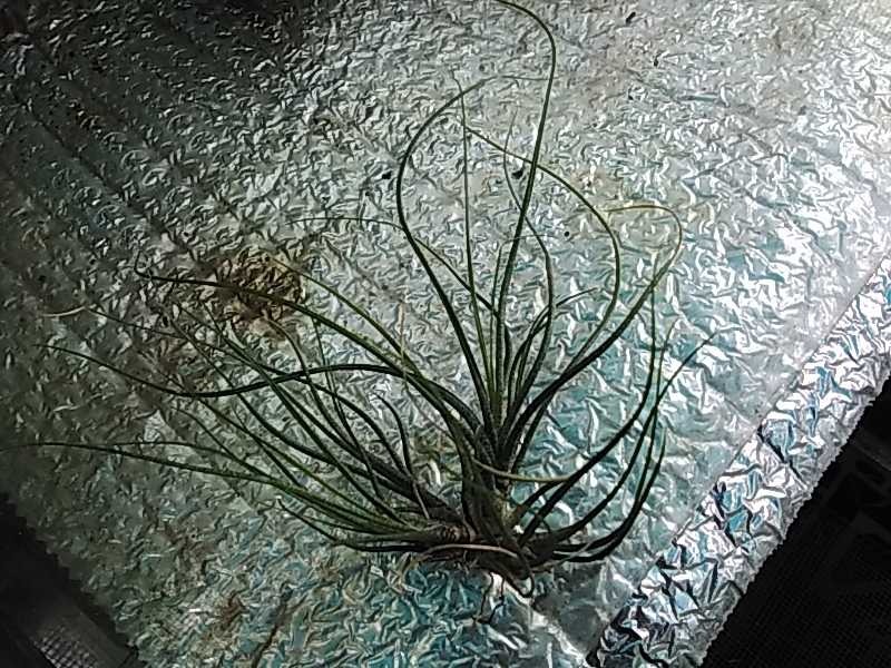 An epiphytic air plant with stiff, subulate leaves that range from dark green to burgundy. It features a clumping growth habit and sharp, pointed foliage that curves slightly as it matures.