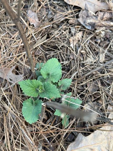 A biennial herb characterized by its heart-shaped or triangular leaves with coarsely toothed margins. In its first year, it grows as a low-lying rosette of green leaves that smell like garlic when crushed.