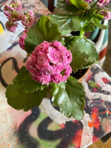 An herbaceous succulent houseplant featuring dark green, scalloped, fleshy leaves and clusters of small, multi-petaled vibrant pink flowers that resemble tiny roses.