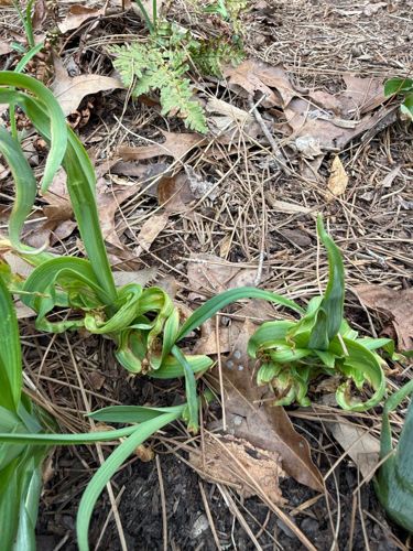 A bulbous perennial plant with long, narrow, grass-like green leaves. The specimen in the image appears to have curled or distorted foliage, which can occur during the formation of 'scapes' or due to environmental stress.