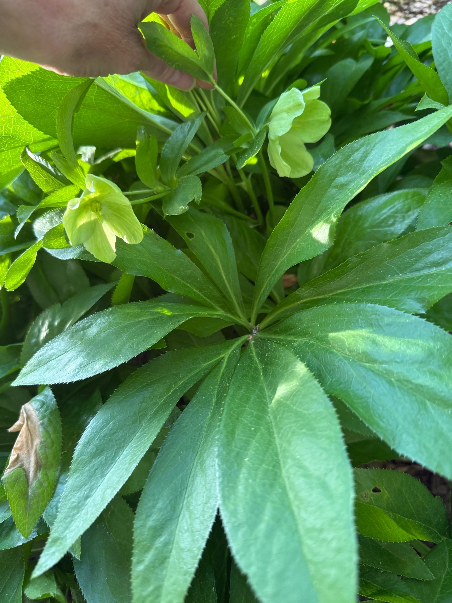An evergreen perennial featuring deeply divided, dark green, leathery leaves arranged in a fan shape. It produces nodding, bell-shaped lime green flowers, often with a subtle maroon edge, atop sturdy stems.