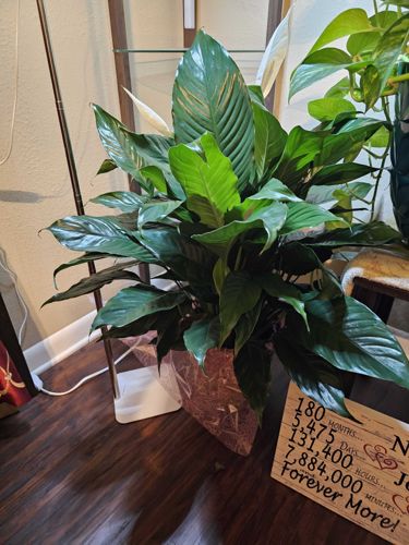 A popular indoor plant known for its dark green, glossy, elliptical leaves and hooded white flower-like structures called spathes that surround a central spike (spadix).