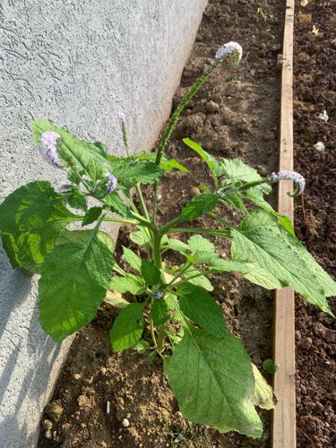 An annual, erect, branched herb known for its small white to pale violet flowers arranged in characteristic curled, scorpion-tail shaped spikes (scorpioid cymes). It has large, ovate, and hairy leaves with deeply impressed veins.