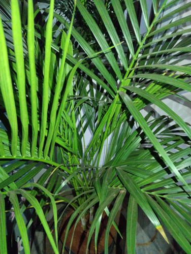 A popular indoor palm featuring smooth, golden-green trunks and feathery, arching fronds with numerous lance-shaped leaflets.