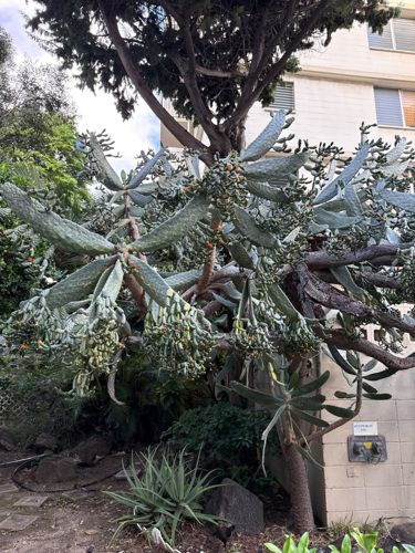 A tree-like cactus with large, flat, green pads (cladodes) and clusters of smaller fruits following yellow or orange flowers.